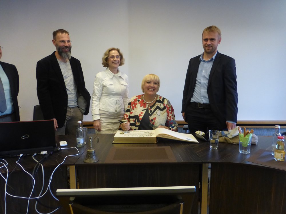 Eine „große Ehre“ sei es, sich ins Goldene Buch der Stadt Regen eintragen zu dürfen, sagte Bundestagsvizepräsidentin Claudia Roth am Freitagnachmittag zu Bürgermeisterin Ilse Oswald. Auf Einladung des Kreisverbands Regen von Bündnis 90 / Die Grünen war die Politikerin in die Kreisstadt gekommen und auch von der Stadtspitze gebührend empfangen worden. Neben den drei grünen Stadträten Petra Wulff-Werner, Ute Senninger und Walter Spiewok waren auch einige Angehörige anderer Fraktionen, darunter 3. Bürgermeister Andreas Kroner, sowie stv. Landrat Erich Muhr erschienen. Roth interessierte sich für die Geschichte und die wirtschaftliche Lage der Kreisstadt sowie für die Beziehungen zum tschechischen Nachbarland. Über die Auswirkungen des Klimawandels im Nationalpark Bayerischer Wald konnte Landtagskandidat Jens Schlüter als ausgebildeter Förster informieren: Die Walddynamik sei ein natürlicher Prozess, der hohe Nadelholzbestandteil in Wirtschaftswäldern bewirke eine große Anfälligkeit. „Die Fichte wird großflächig absterben“, prognostizierte er. In lockerer Gesprächsatmosphäre setzte die Spitzenpolitikerin schließlich ihre Unterschrift auf die von Künstler Manfred Homolka gestaltete Seite im Goldenen Buch.