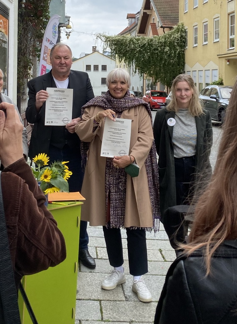 Zusammen mit MdB Erhard Grundl besuchte die Bundestagsvizepräsidentin Claudia Roth Viechtach. Unbedingt wollte Erhard Grundl ihr das Thema Waldbahn Gotteszell-Viechtach ans Herz legen, deshalb fuhr er mit ihr per Zug von Teisnach nach Viechtach. Nach ihrem leidenschaftlichen Plädoyer für den Erhalt der Strecke sowie für ein flächendeckendes leistungsfähiges Bahnnetz auch auf dem Land folgte ein Stadtrundgang. Roth und Grundl besuchten den lichtung verlag und besichtigten die wunderschöne Stadtpfarrkirche. Verwundert zeigte sich Roth über den Abriss eines denkmalgeschützten Gebäudes an der Stadtplatzwestseite, umso mehr freute sie sich über die Rettung und gelungene Sanierung des Penzkoferhauses, in dem seit Kurzem LichtFreude, ein Laden für nachhaltige Beleuchtung, daheim ist. Danach empfing das Team des Weltladens die Politiker, die beide das Fairsprechen für ökologischen, sozialen und humanitären Welthandel unterschrieben. Dann warteten schon die Betreiber des Biomarktes Kornhaus auf Roth und Grundl. Bei Kaffee und Kuchen erläuterte Roth die Grundpfeiler grüner Politik und unterstrich, wie sehr sie sich in allen Belangen mit ihrem Bundestagskollegen Grundl versteht.