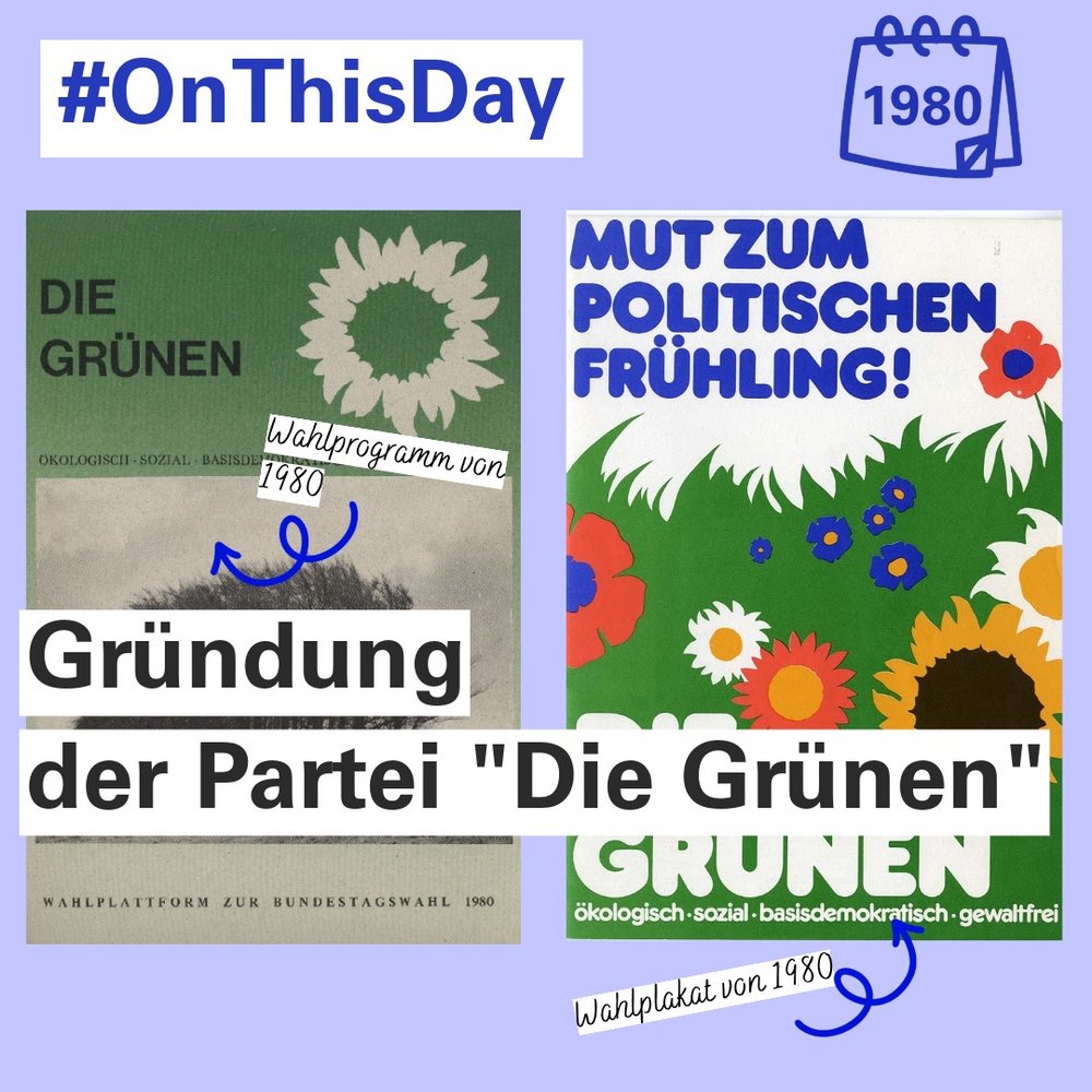 "Am 12. und 13. Januar 1980 gründen sich “Die Grünen” als Bundespartei. Verschiedene Gruppen kommen auf dem Gründungsparteitag in Karlsruhe zusammen: u.a. Mitglieder von Umweltverbänden, Anti-AKW-Gruppen, der Friedensbewegung, Fraueninitiativen und der Studentenbewegung sowie der kapitalismuskritischen Linken. #OnThisDay
