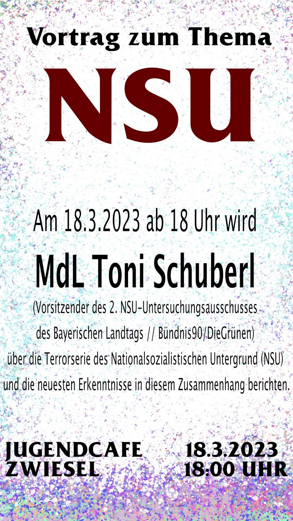 ...im Jugendcafé Zwiesel, am 18. März 2023 ab 18 Uhr über die Terrorserie des "Nationalsozialistischen Untergrunds" (NSU) und die neuesten Erkenntnisse in diesem Zusammenhang