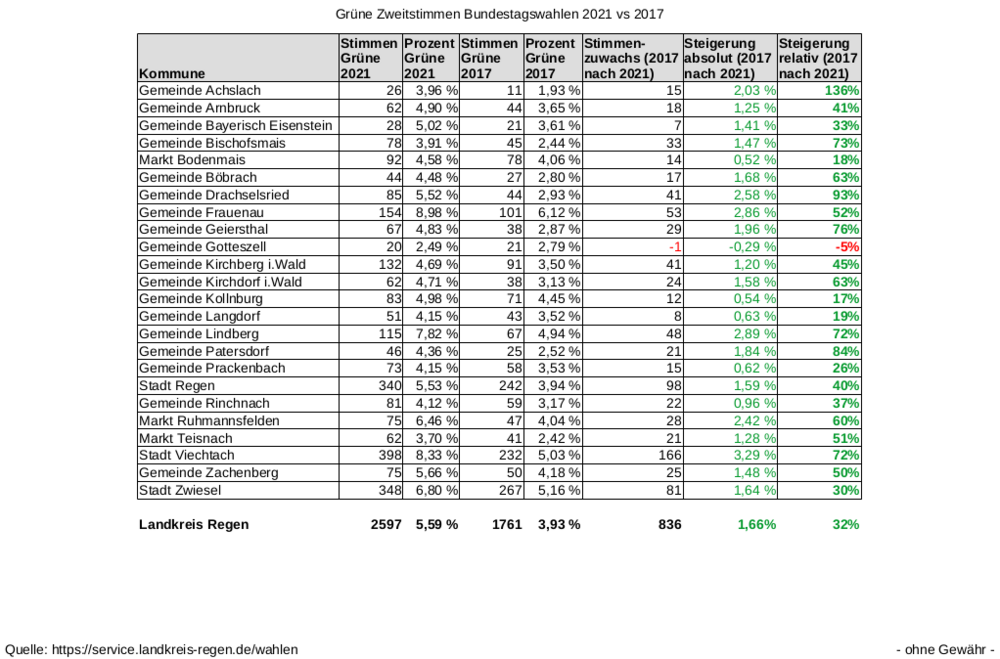 Anders sieht es im Landkreis Regen aus. Doch auch wenn hier die Grünen prozentual weit unter dem Bundesdurchschnitt gewählt worden sind, verzeichnen wir fast in allen Gemeinden einen Stimmenzuwachs!