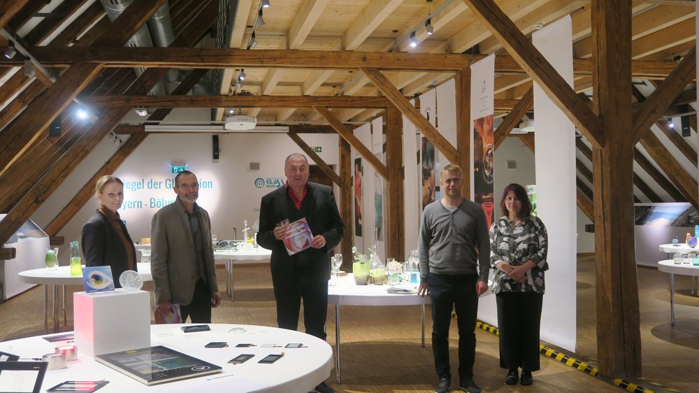Tief beeindruckt von der Vielfalt, Vitalität und Modernität des Kulturgutes Glas in Bayern und Böhmen zeigte sich MdB Erhard Grundl (Bündnis 90 / Die Grünen) im Waldmuseum Zwiesel. Bei der Vernissage im August war er terminmäßig verhindert gewesen. Der Kulturpolitiker hat nun den Besuch der Ausstellung „Spiegel der Glasregion Bayern-Böhmen“ nachgeholt. Zusammen mit Zwiesels 3. Bürgermeister Jens Schlüter erhielt er von Gunther Fruth, dem Leiter der Glasfachschule Zwiesel, eine kundige Führung durch die bald endende Sonderschau im Kulturzentrum Waldmuseum. Mit dabei waren auch die stellvertretende Schulleiterin Iris Haschek und die neue Chefin des Waldmuseums, Stephanie Falkenstein. Nicht nur die einzelnen Tische mit den Exponaten verschiedener Glas-Unternehmen dies- und jenseits der Grenze waren durch zwei Absolventinnen der Glasfachschule Zwiesel gestaltet worden; die Kuratorinnen hatten die gesamte Organisation, von der Teilnehmer-Akquise über die Ausstellungstexte bis zum Bannerdruck und zur Pressearbeit verantwortet. Gunther Fruth und Iris Haschek zeigten sich dementsprechend begeistert von der hohen Professionalität ihres Glasnachwuchses.