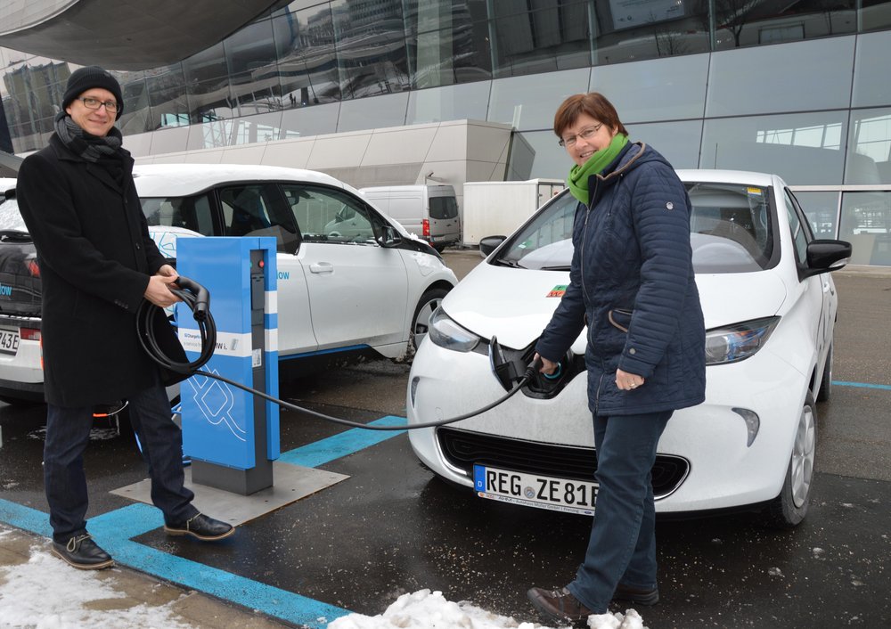 Grünen-Marktrat Michael Vogl fuhr zur Abschlussveranstaltung der Modellregionen E-Mobilität nach Garmisch-Partenkirchen. Standesgemäß war er mit einem Elektroauto unterwegs. Begleitet wurde er von der Grünen-Landtagsabgeordneten Rosi Steinberger. Bei einem kleinen Zwischenstopp in der BMW-Welt München konnten Fahrzeug und Fahrer frische Energie tanken.