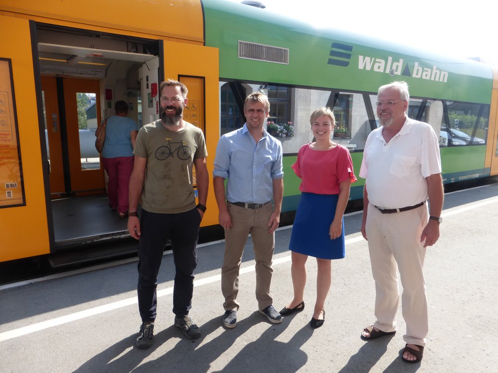 Ausdrücklich lobte Katharina Schulze die persönliche Kundenberatung in der Waldbahn, wo man die Tickets nicht am Automaten erwerben muss, sondern bei den freundlichen Zugbegleitern. Damit die Akzeptanz der Allgemeinheit für öffentliche Verkehrsmittel schneller geht, müsse er „attraktiv und einfach“ gemacht werden, sagte sie. Länderbahn-Marketingleiter Michael Pfeffer merkte an, dass das Bayerwaldticket für 9 Euro diese Anforderung schon erfülle – es sei einen ganzen Tag lang im gesamten Waldbahnnetz für Bus und Bahn gültig. Dass an Bahnhöfen und Haltestellen noch viel Verbesserungspotential ist, meinte Wolfgang Schlüter. „Wir hätten das Geld, um Bahnhöfe und Infrastruktur zu verbessern“, sagte darauf die Landtagsabgeordnete, den Grünen sei es wichtig, dass nicht nur in den Straßenbau, sondern in die ÖPNV-Infrastruktur investiert werde. Michael Pfeffer, Marketingleiter der Länderbahn, warf ein, die Strecke nach Gotteszell sei nie stillgelegt worden und ihre Infrastruktur sei intakt, es handle sich genau genommen also nicht um eine Reaktivierung.
